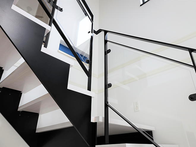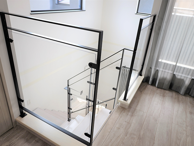 また、手摺は同じくブラックのフラットバーとクリアパネルを組み合わせており、視覚的に開放感を持たせつつ、安全性も確保しています。