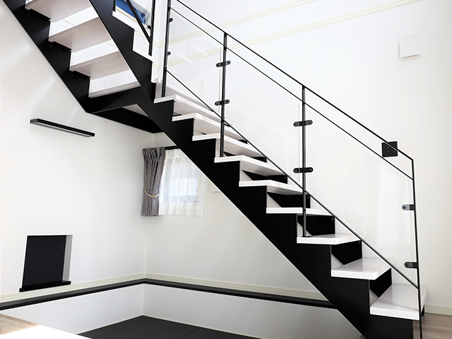 鉄骨のささら桁は、ひな壇タイプのスケルトンデザインで、中段でL字に折れるエレガントなフォルム。ブラックの鉄骨部分が、空間のモノトーンの調和を引き立てるアクセントとなっています。