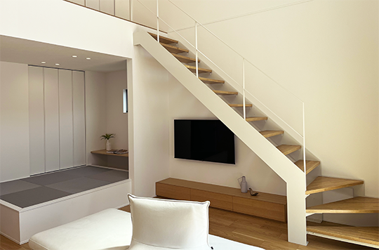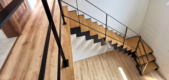 鉄骨の桁と木製踏板を組み合わせたモダンな表情のオープン階段です。