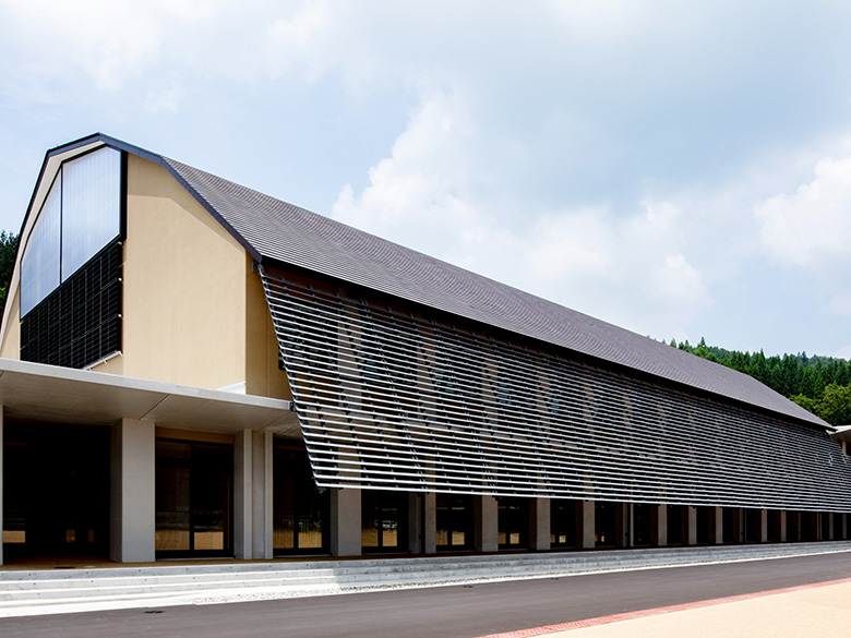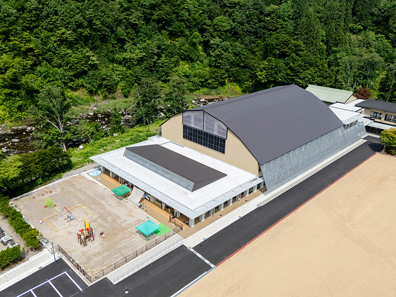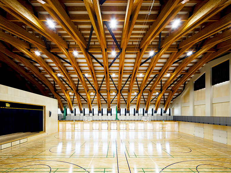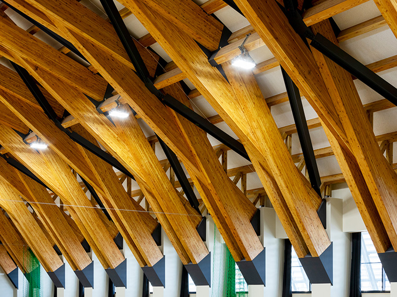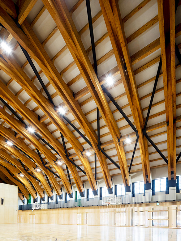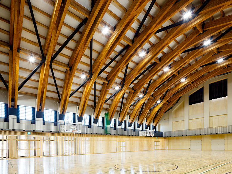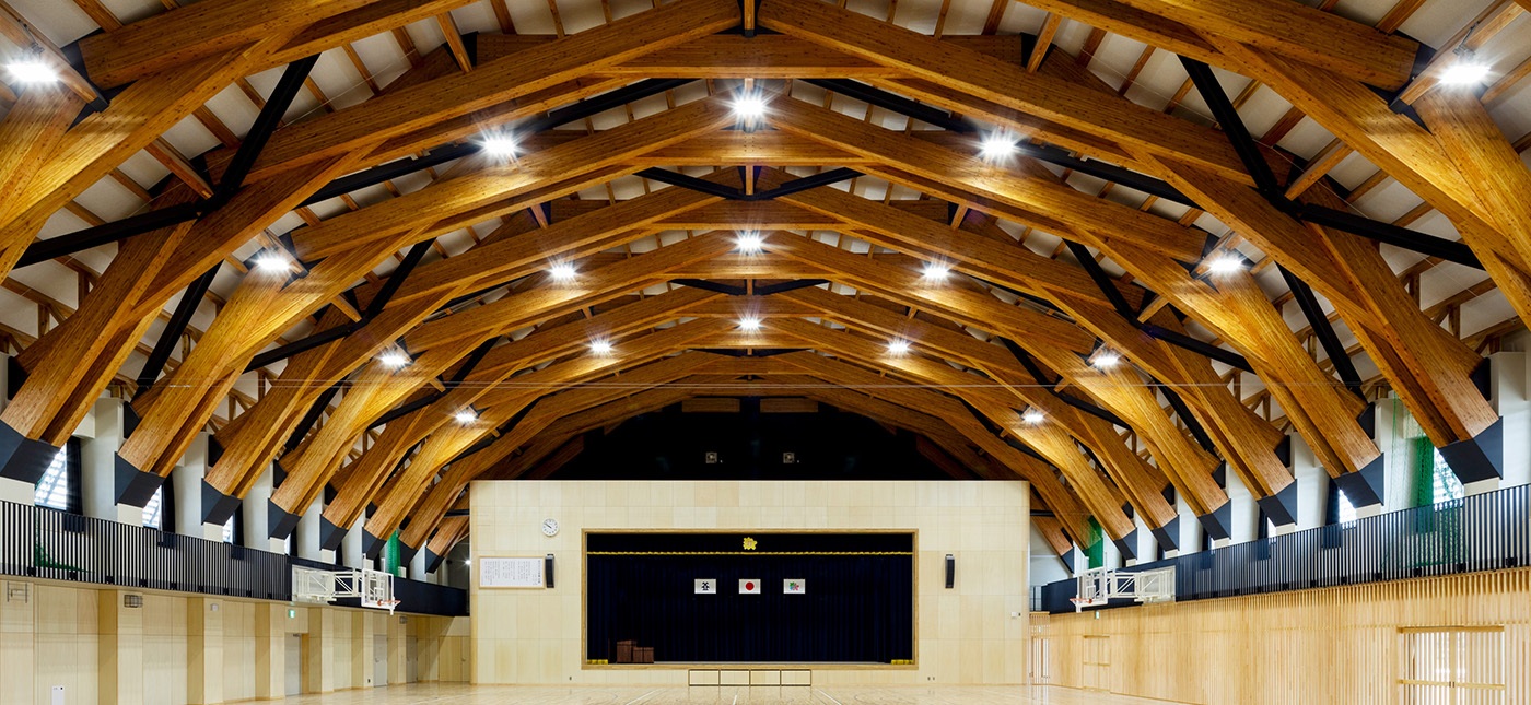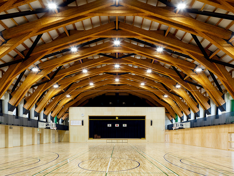 屋内運動場には、国産カラマツや岐阜県産ヒノキをふんだんに使用。当社は木架構の材料調達、プレカット加工、建て方までを手掛けました。木の温もりと香りに包まれ、地域の木材を活かした大空間が広がります。
