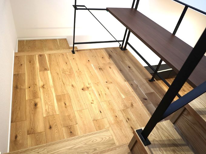 階段はナラ樫の銘木化粧貼り仕上げ。あたたかみのある木目が空間にやさしくなじみ、住まいのアクセントとしても印象的な存在となっています。